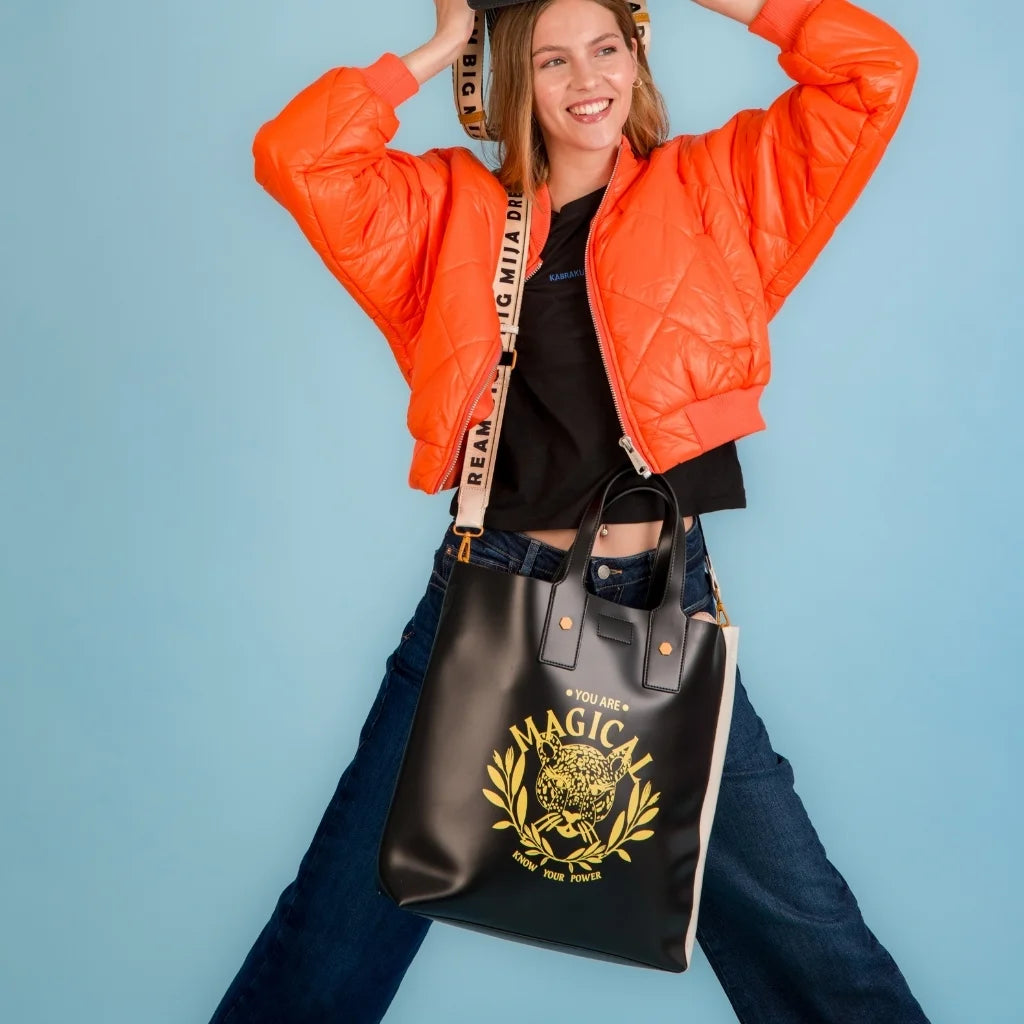 Gracias a su tamaño grande y diseño inteligente, puedes utilizarla de dos formas: como shopper de mano o como bandolera, gracias a su correa desmontable. Fabricada en PU bifaz con un acabado gamuzado en el interior, ofrece una textura suave y agradable al tacto.